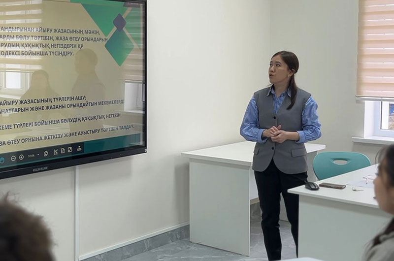 24.02.2026ж. “Заң” факультеті, “Азаматтық және қылмыстық құқық” кафедрасының сеньор-лекторы Айнұр Асқарбекқызы ҚР Қылмыстық атқару құқығы пәнінен “Қылмыстық жаза түрі ретінде бас бостандығынан айыру және жазаның осы түрін өтеп жатқан сотталғандардың құқықтық жағдайы” атты тақырыбында 3 курс студенттері ҚҚ-23-5, 7, 9 топтарына ашық сабақ өткізді.